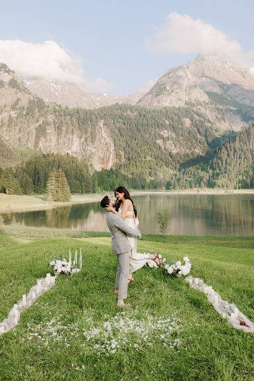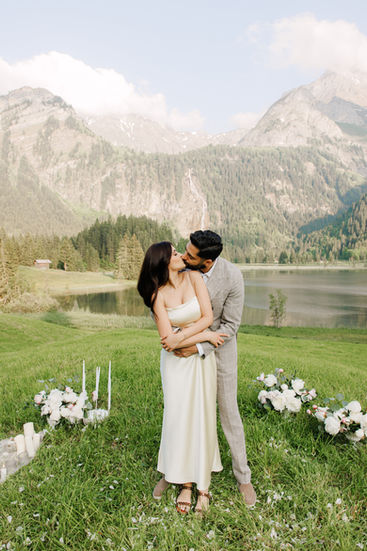 Nestled in the breathtaking landscapes of the Gstaad region, this romantic proposal took place by the serene Lauenensee lake—an unforgettable moment designed for a couple visiting Switzerland from Canada. The groom-to-be reached out to us with a heartfelt idea: to create a magical setting where he could surprise his girlfriend during their travels. Inspired by the natural beauty of the Bernese Oberland, we crafted a proposal scene that blended effortlessly with the surroundings—elegant, intimate, and deeply personal. Every detail was tailored to their love story, making it a truly once-in-a-lifetime moment in the Swiss Alps.